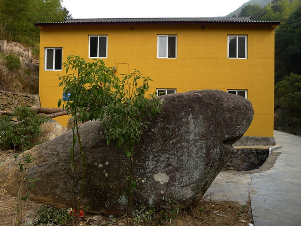 隨著水泥臺階蜿蜒而上,一刻鐘后便到了赤師廟,廟名赤師,不知何意。赤師廟前,新修了一座寬大的供行人休息的廊屋,廊屋大概是行善者捐助修建,屋內(nèi)豎有一塊石碑,碑上刻有樂助人的姓名和款項(xiàng)。廊屋前臥有一塊巨巖,形似癩蛤蟆,俗稱“蛤蟆巖”。過了赤師廟后的小橋往上,便沒了水泥臺階,而都是“原生態(tài)”的碎石村道,路邊不時(shí)可見塊石壘砌的石墻斷垣。據(jù)有關(guān)資料記載,白云山上先后有井墩、鳳陽、新安、下士、小滴水、窩麻巖等七個(gè)自然村。其中井墩村,有20多戶人家,離水磨坑