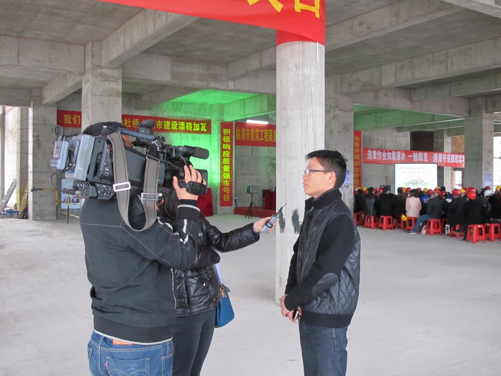 現(xiàn)場(chǎng)會(huì)時(shí),臨海電視臺(tái)的記者采訪了市建筑工程質(zhì)量監(jiān)督站站長(zhǎng)葉青同志和我公司副總經(jīng)理王國(guó)棉同志。葉青同志認(rèn)為東部很多工程項(xiàng)目都是招商引資過(guò)來(lái)的,大多是外地的建設(shè)單位和施工單位,對(duì)我們當(dāng)?shù)匕踩芾硪?guī)定不是很熟悉,以這個(gè)工地為標(biāo)桿,開(kāi)展樹(shù)標(biāo)桿學(xué)標(biāo)桿活動(dòng)旨在提高東部區(qū)塊施工現(xiàn)場(chǎng)的管理水平。王國(guó)棉同志著重介紹了該工程安全方面的一些亮點(diǎn),如臨邊防護(hù)、電梯井、洞口防護(hù)都采用定型化、工具化的產(chǎn)品。工程現(xiàn)場(chǎng)布置人性化,特別是在三樓預(yù)埋構(gòu)造柱的鋼筋周邊加了圓形保護(hù)筒,一則防止對(duì)鋼筋的破壞,二則安全防護(hù),防止人不小心踩上去。